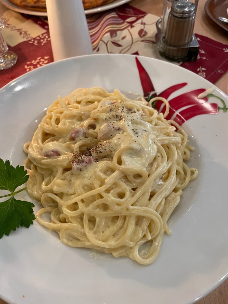 カルボナーラとキノコのピザ?…